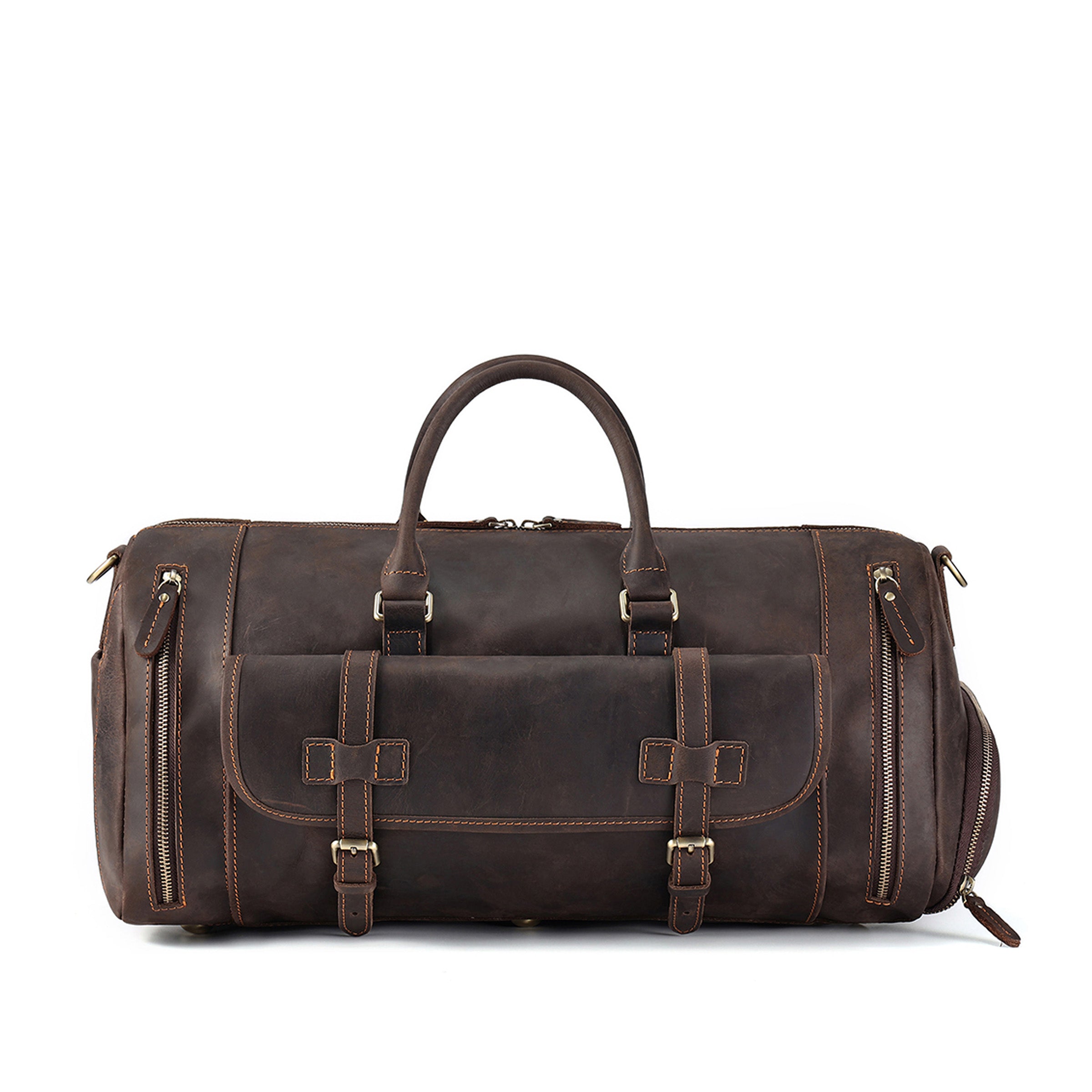 With its spacious design, this duffle bag is perfect for longer trips, providing ample room for all your essentials and more. The top-layer cow leather not only adds character but also tells the story of your travels, creating a unique accessory that evolves with your journey.