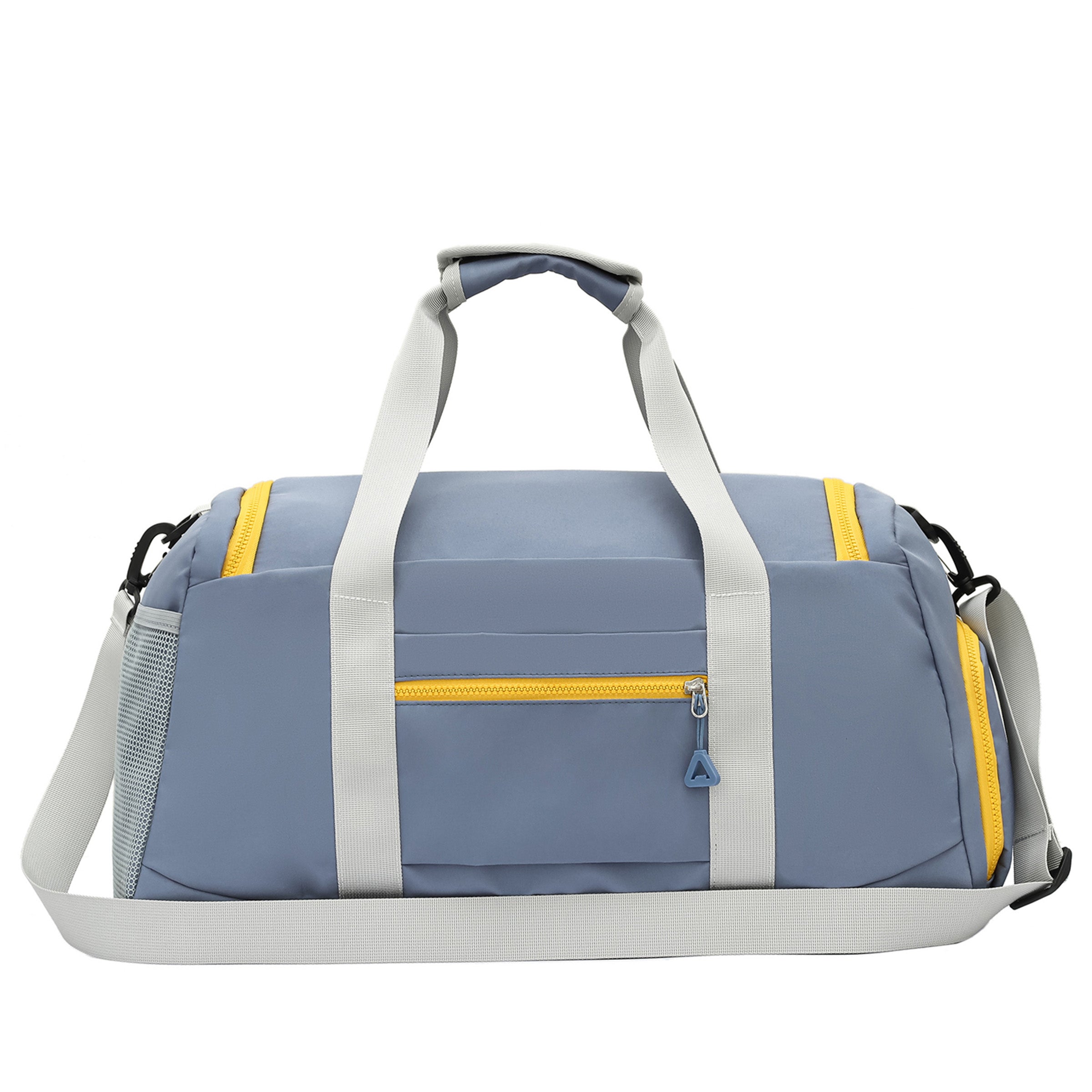 This bag features a large main compartment, with 2 inner pockets and a zippered wet pocket to keep your clothes, towels, and food organized. A separate bottom compartment stores shoes and dirty clothes, while an exterior pocket holds a water bottle or umbrella. There’s also a front pocket and a back zip pocket for keys.